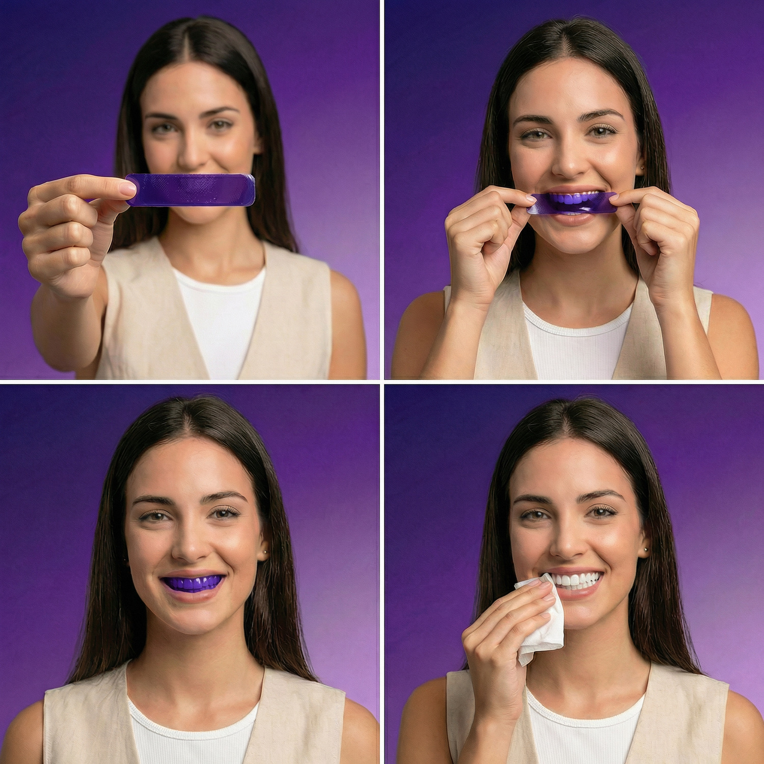 Aplica la tira sobre los dientes limpios y secos, presiona suavemente para que se adhiera bien y déjala actuar durante 30 minutos.